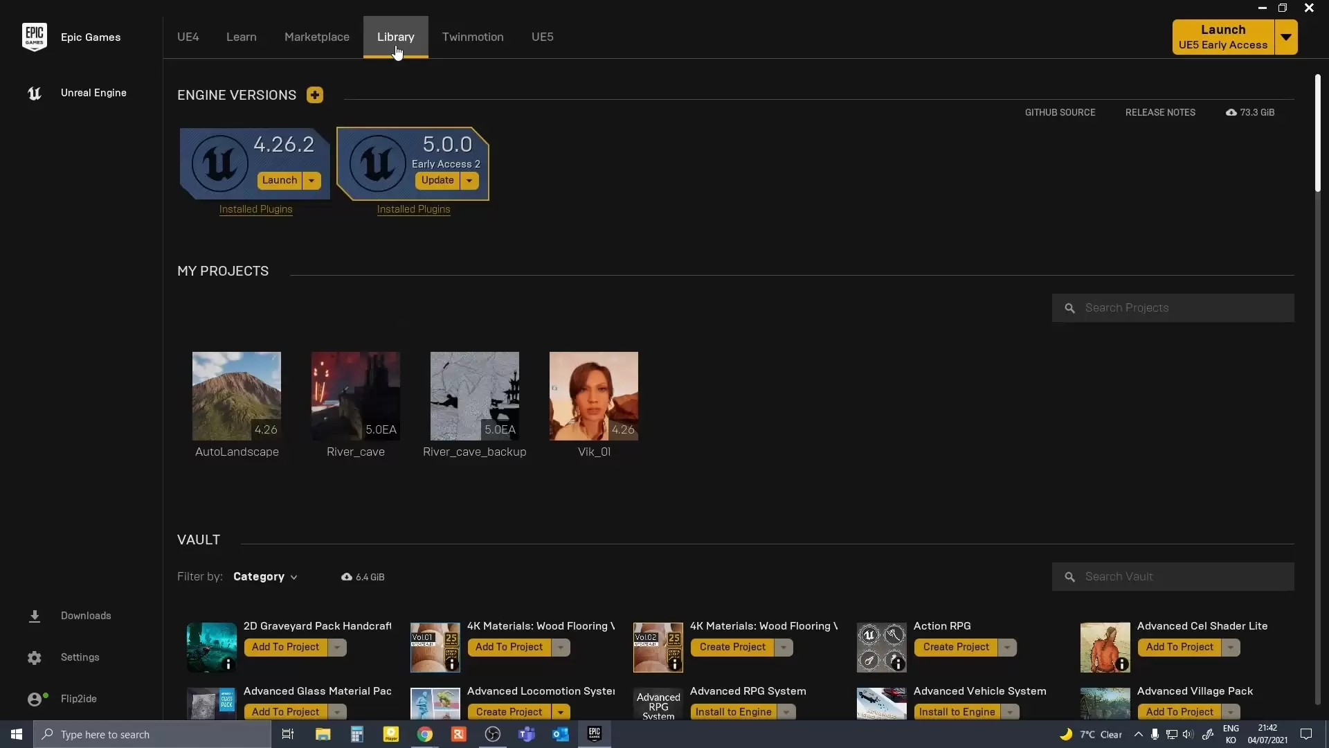 언리얼엔진 설치하면 보이는 에픽게임스 론쳐 화면입니다. 에픽게임스에서 게임을 구매하려면 보통 이용하는 같은 론쳐입니다.