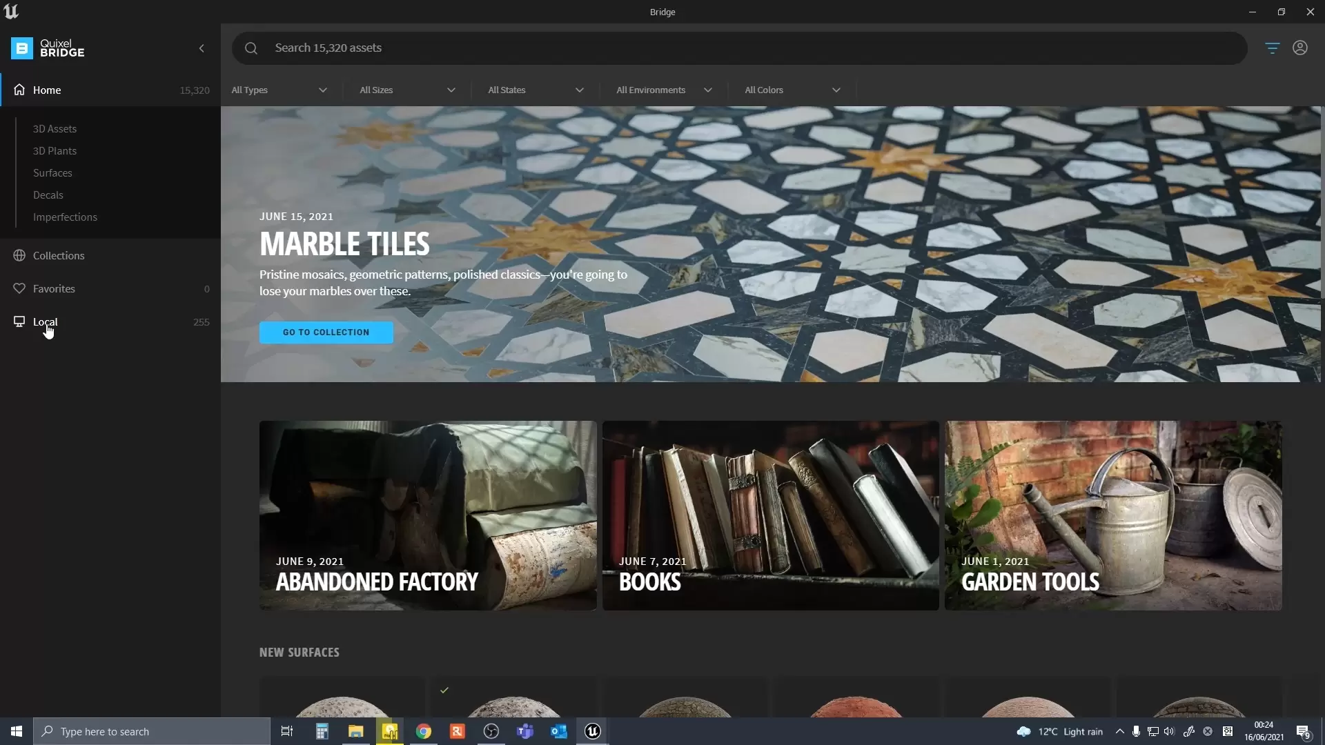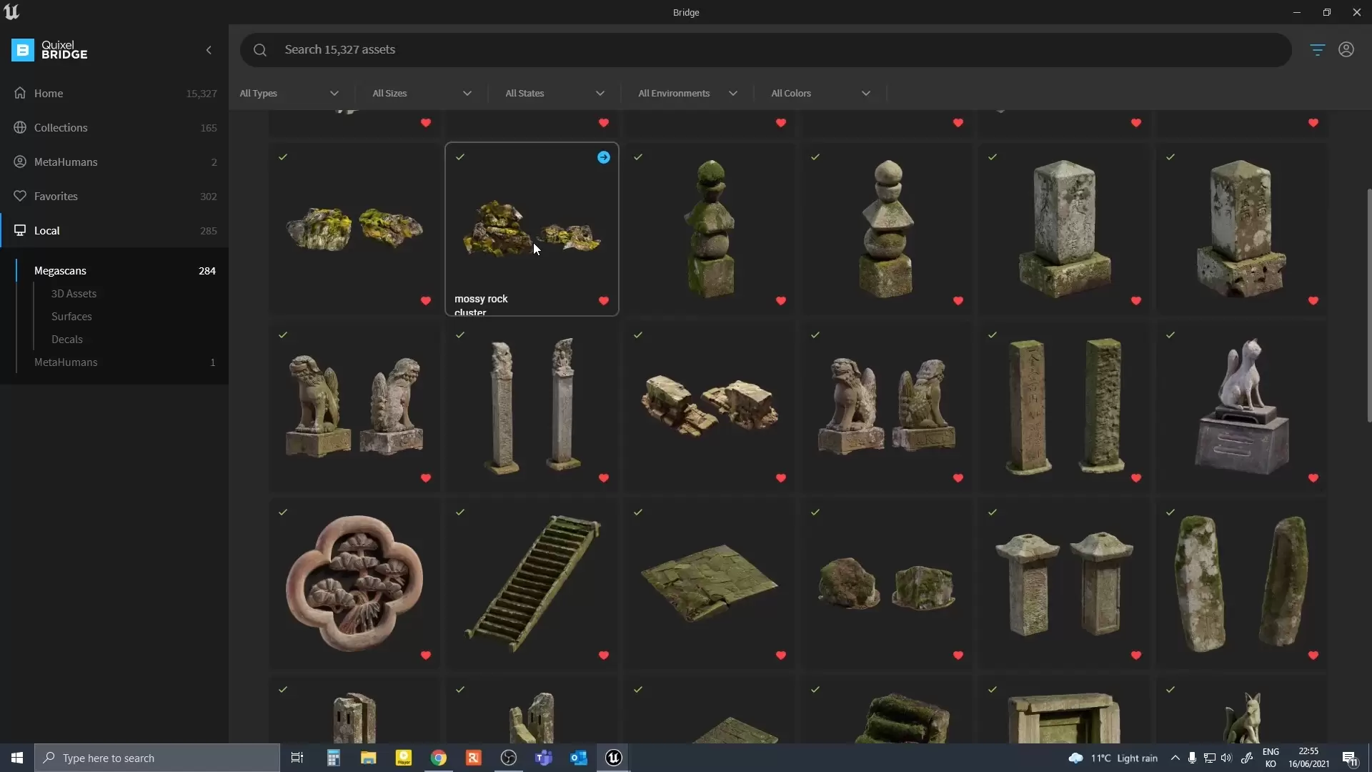 메가스캔 라이브러리 메인 화면입니다. UE4 에서는 따로의 어플리케이션으로 존재하는데 UE5부터는 아예 엔진 자체내장으로 바뀌었습니다.