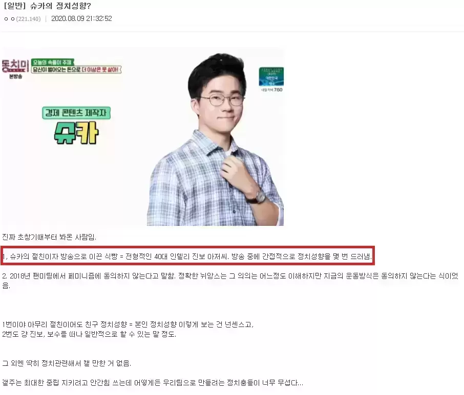정작 슈카는 보수인지 진보인지도 말 안했는데 혼자 쉐도우 복싱 하고 있네? ㅋㅋㅋㅋ