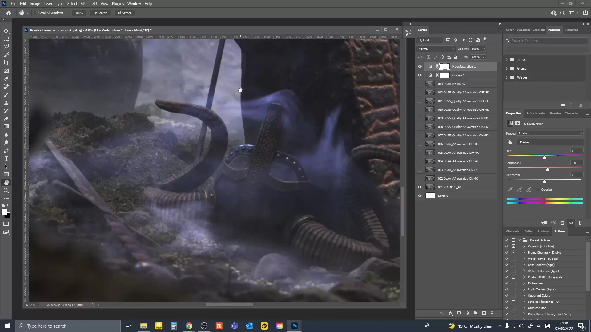 장점: DLSS를 적용하면 같은 사양에서 더 높은 해상도로 렌더링 할 수 있습니다. 예를 들어 제 컴퓨터(RTX3080)에서는 항상 4K 결과물로 렌더링 하는게 한계였습니다 (프로젝트 마다 다르지만 대부분의 경우에 그랬습니다). 하지만 DLSS 적용하니 경우에 따라 8K도 렌더링이 가능했습니다. 시험목적으로 긴가민가 하면서 해봤는데 뻑안나고 끝까지 잘 렌더 완료했습니다. 물론 8K 결과물이 필요한것도 아니고, 진정한 의미의 8K도 아니지만 (낮은 화질을 업스케일링 하는 것이니), 8K 프레임을 출력할 수 있다는 사실 자체가 놀라웠습니다. 그리고 같은 해상도로 렌더링 했을 때는 DLSS 적용 한 쪽이 훨씬 더 빨랐습니다.